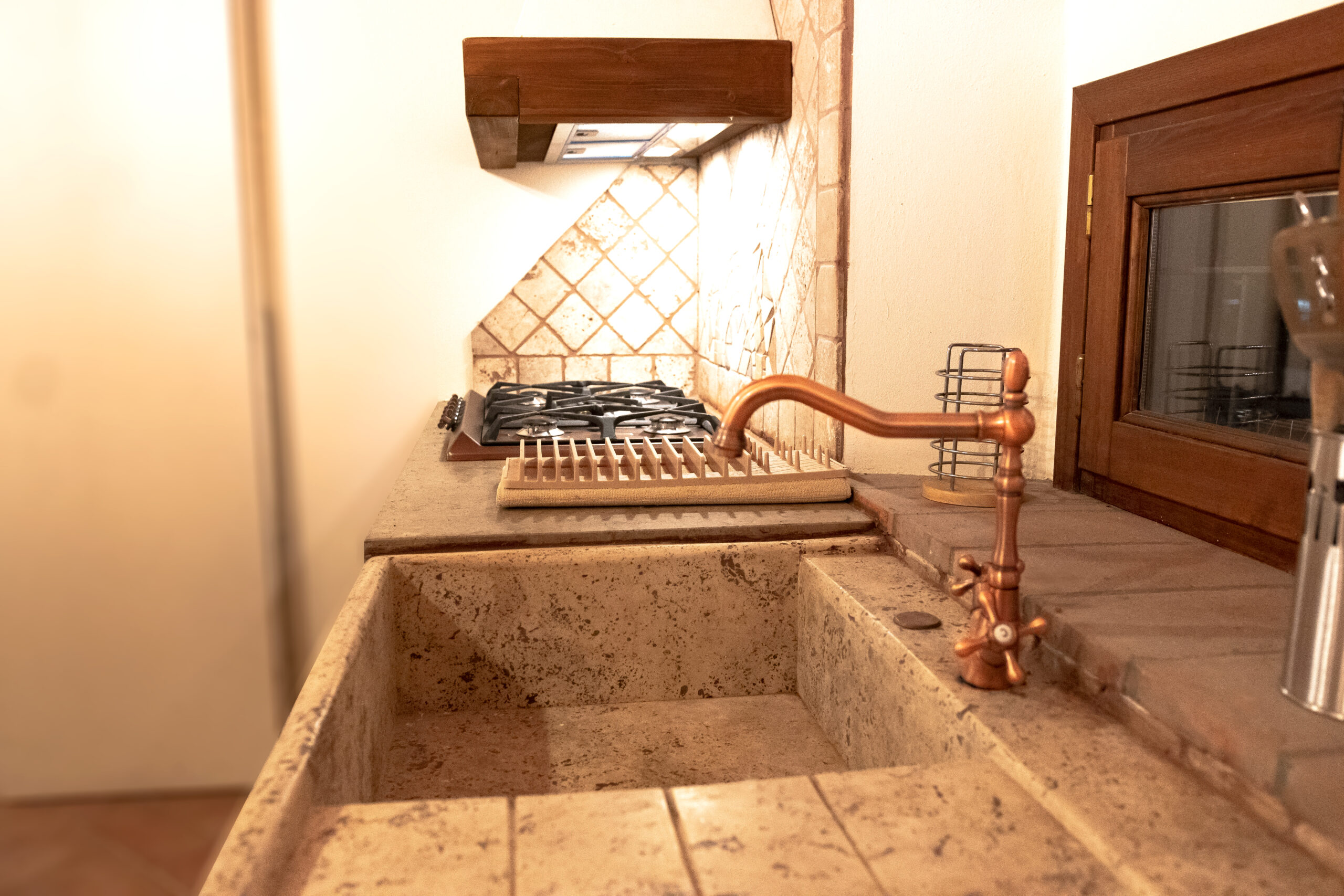 Sulla sinistra c’è ripostiglio con un lavandino e spazio per lasciare le valigie.