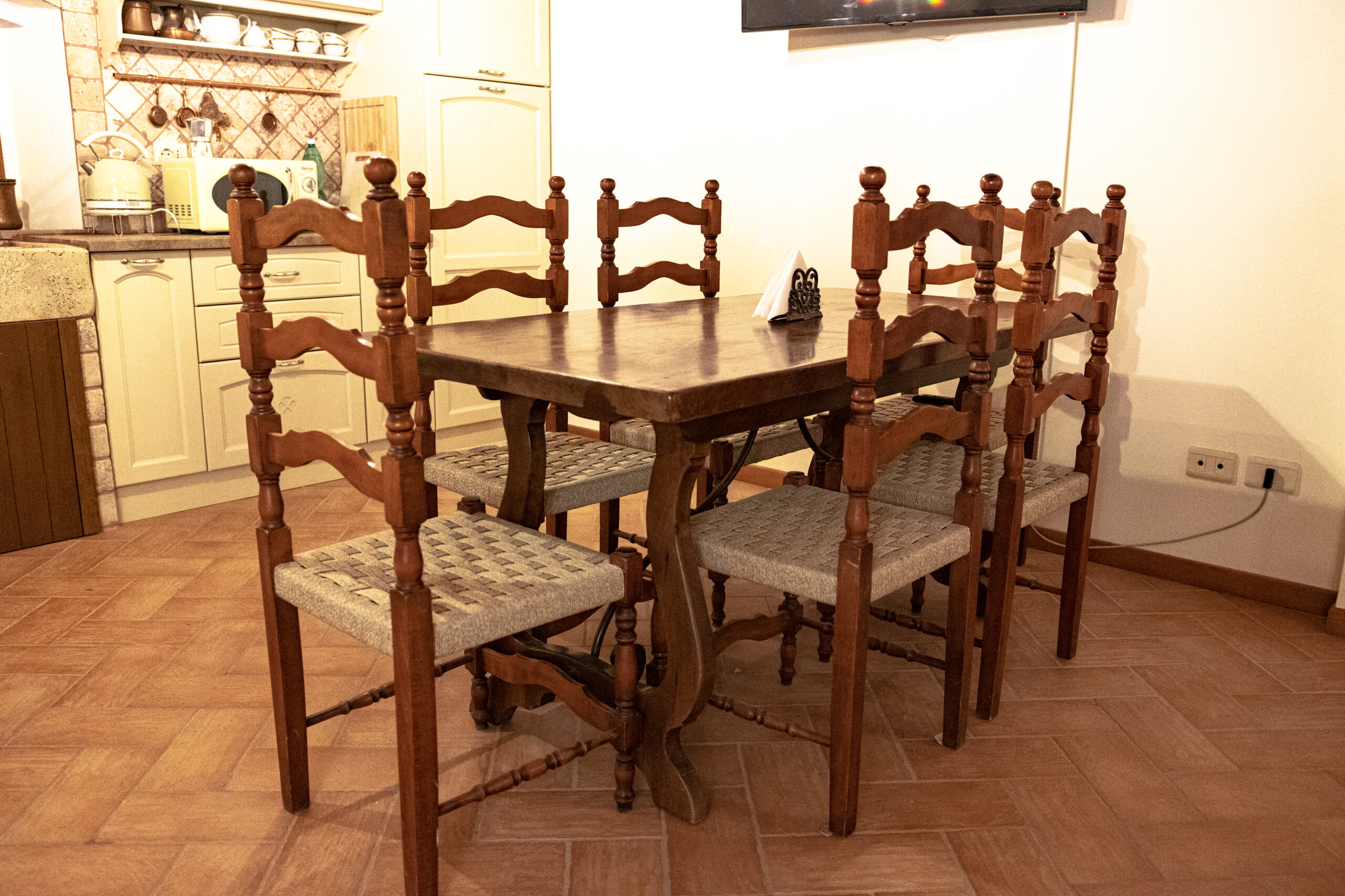 Tavolo completo per 6 persone, seggiolone per neonati, Maxi Tv, Cucina 6 fuochi, Forno, Frigo con Freezer, Microonde, Bollitore, Macchinetta del caffè, Aria condizionata ed altri accessori.,